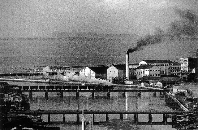 | 石城橋・1960年 煙を上げてSLが走るのは、最近まで残った長浜の引込線 |