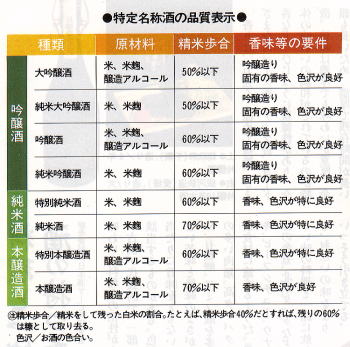 精米度を覚え易くするためには、吟醸・純米・醸造を並列に並べて、 純米・醸造は普通と上位の2種類(どちらも「特別」がつく)しかなく、吟醸のみ普通がなく、最下位が前2種の上位と同格でその上に「大」があることに注目する。