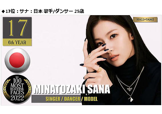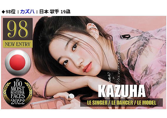| 毎年年末に映画評論サイトのTC Candlerが発表する「世界で最も美しい顔トップ100」の2022年版が発表されました。 2021年版では日本から女優の山本舞香、小松菜奈、石原さとみ、TWICEの湊崎紗夏(サナ)と平井もも(モモ)、PURPLE K!SSの毛利小雪(ユキ)の6人が選出されていました。 2022年版では山本舞香、小松菜奈、石原さとみ、モモ、ユキが選外となり、新たにAKB48の行天優莉奈、XGのHARVEY、女優の大和田南那、NiziUのニナ、LESSERAFIMのカズハが選出されています。 |