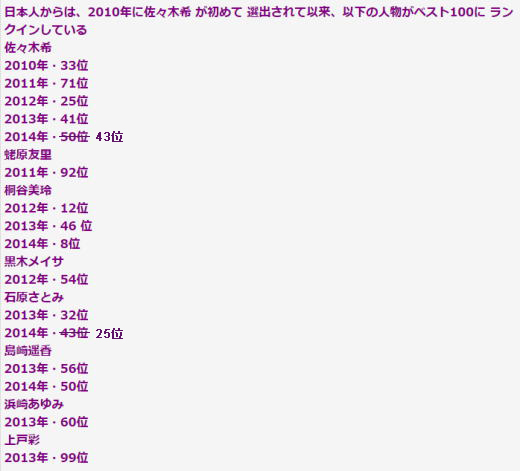 ちなみに、2013年は http://matome.naver.jp/odai/2138792027386983901? page=7 日本人歴代ランクイン一覧 ↓ ゴシップ速報 http://gossip1.net/archives/1016497282.html より(誤記載⇒修正) ![]() |