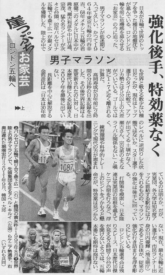 | このように、どこかのサイト・タイトルどおりの結果で決着したロンドン五輪男子マラソン代表選手選考。 千葉すず(マラソンじゃないが)・松野明美など選ばれる側からの選考に対する抗議はもとより、民間からの異議・批判も少ないかわり、本番での活躍に対する期待感も、前回世界選手権同様、もっとも薄い選考ではなかったか。 現在、世界歴代10傑はケニア7人、エチオピア4人(5・10位同記録)とすべてアフリカ勢に占められている。 しかも、2010年以降にそれらの記録を残しているランナーが7人いる。 それに対し日本では、歴代6位まではすべて過去の選手(4位・佐藤敦之の過去人扱いには異論があっても、もはや7分台の走力が残っていると思う者はいないだろう)であって、7位・7分48秒の藤原新が現役最高位である。 これを世界と較べると、世界10位・4分55秒とは3分弱ものの差がある。 |