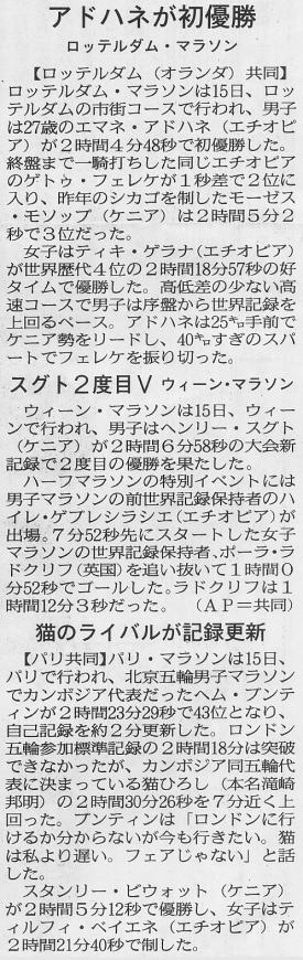 約2%世界に近いといえ、それだけ強化・意識の高さが人種による身体能力の差をカバーしているともいえるのではないか。 ここで、sportsnavi で言う“国民の意識”について考えると、日本人のマラソン・駅伝好き国民性は、伊東浩司より高岡寿成の知名度が高いということからも明らかなように、マラソンに対する想い入れは大きい。 世界と互角に戦ったという意味では、100メートル走は1930年代の“暁の超特急”吉岡隆徳まで遡らねばならず、一方マラソンは日本新が絶えて久しいがそれでも高岡はまだ10年の昔、この、栄光の幻を追い続ける(諦めきれない)想いの差が“国民の意識”に表れているといったところだろうか。 こう言っていて、アテネ五輪の野口のような大番狂わせが起こるとしばらくは 発言の“蟄居”を余儀なくされる羽目に陥るが、今回のメンバーでは女子も含めてそのような“危惧”は余計であろう。 |
