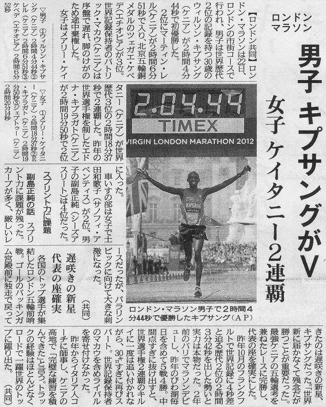 ![]() ↑ フランクフルトを2時間3分42秒で走った、ウイルソン・キプサング(ケニア) 日本が世界の高速化について行けないのはもう何度も見せつけられているが、実力者の揃わなかった福岡国際では笑えるほどの力の差を突きつけられたと言える。 右で「カモちゃん」とやらは暢気に勝負の観戦を楽しんでいるようだが、日本陸連(というのか?)の当事者連はもうお手上げ状態だろう。 川内は、公務員ゆえに練習量も少なく、特にフルマラソンの距離を走ることも稀だそうなので、自身も言っているとおり、試合が練習の一環ということで、使い減りしていない身体だから短いスパンでレースがやれるのはある意味当たり前のことだろう。 |