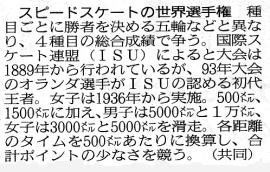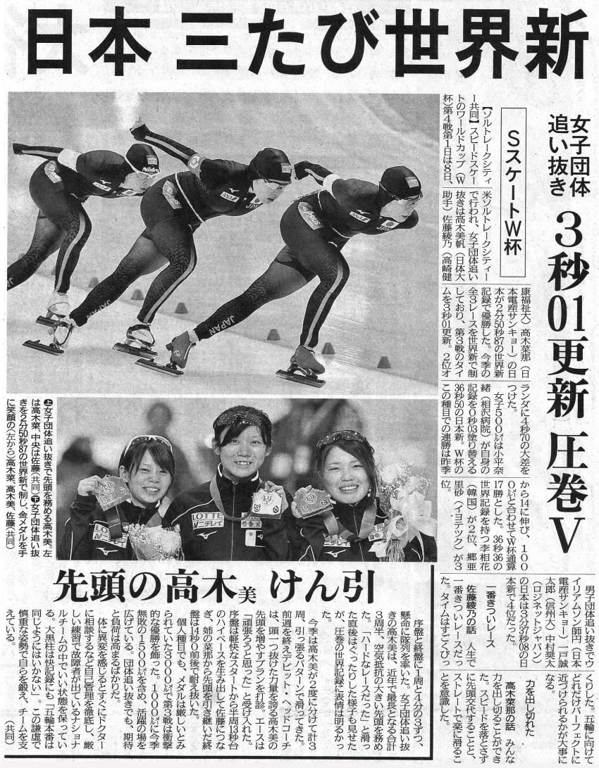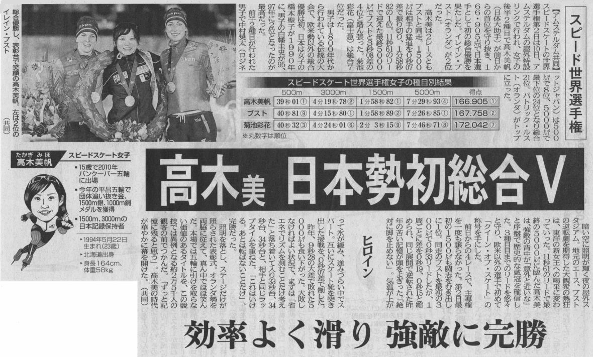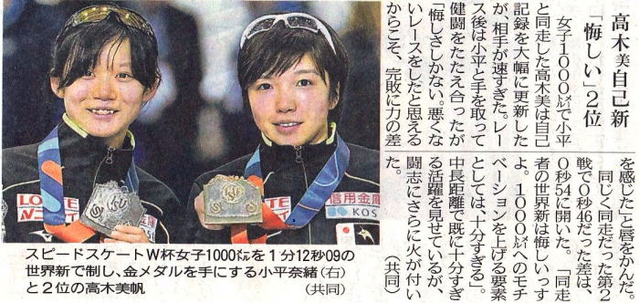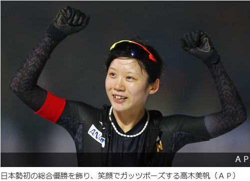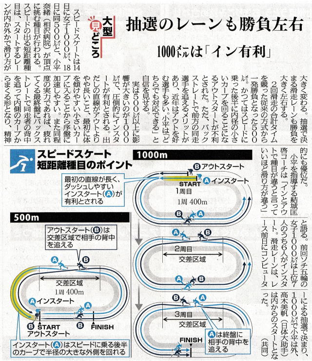 | NETで高木の得点とともに優勝を前日に知ったが、2位の得点が書いてないわ、そもそも点数そのものの意味がわからず“勝ちっぷり”を知りたい身としてはもどかしさが残っていた。 それが上記の得点配分記事によりやっと理解できた。 逆に考えると、最終種目5千Mを前に11.61秒優位であることは5百Mで18秒(5千M換算で)稼ぎ出していることが如何に大きいかが理解できる。 |