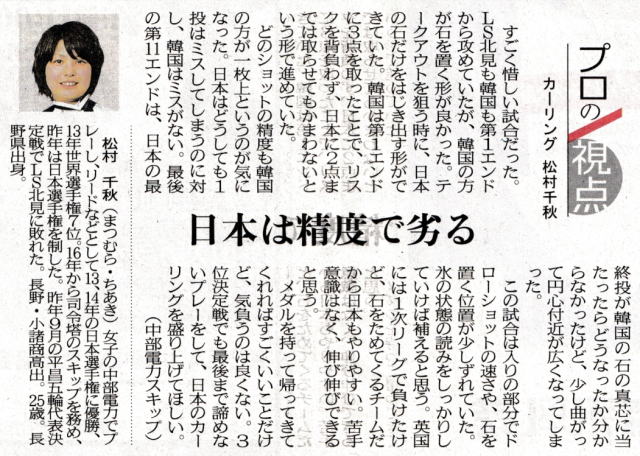 略歴にもあるとおりここで「解説」しているのは、LS北見と五輪出場を賭けて敗れたチームのスキップである。 解説者の地位として少々“奇異”に感じるのは私だけか。 |