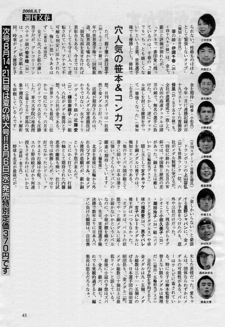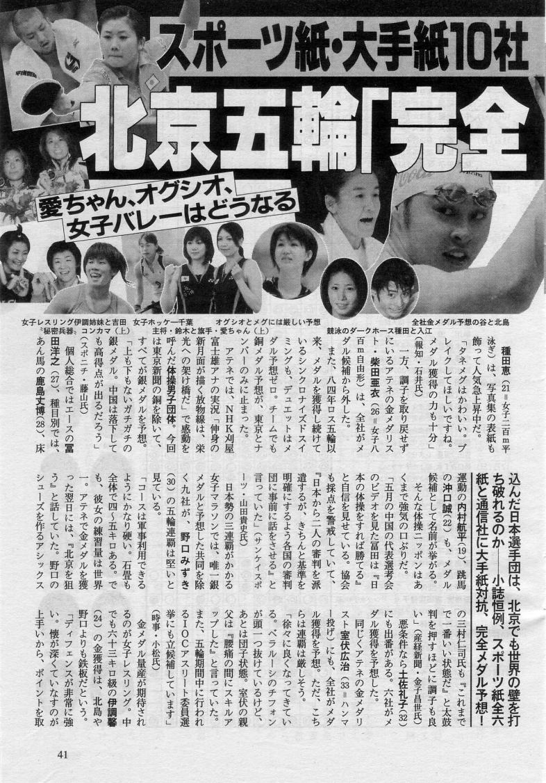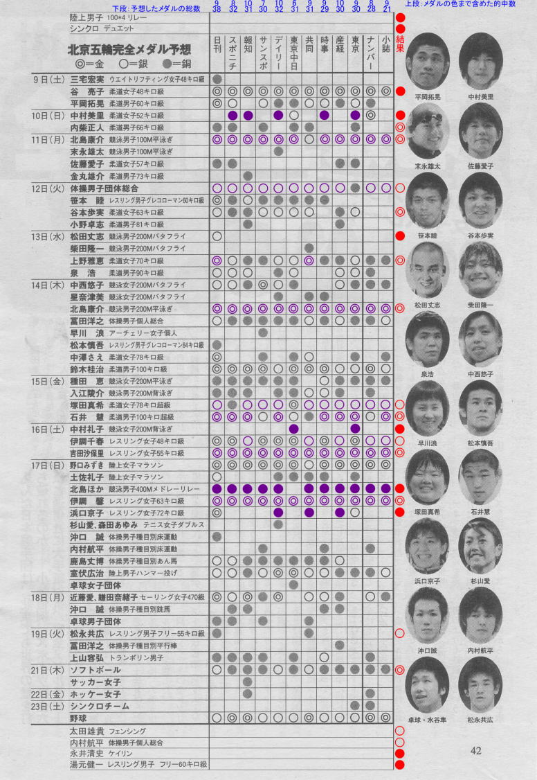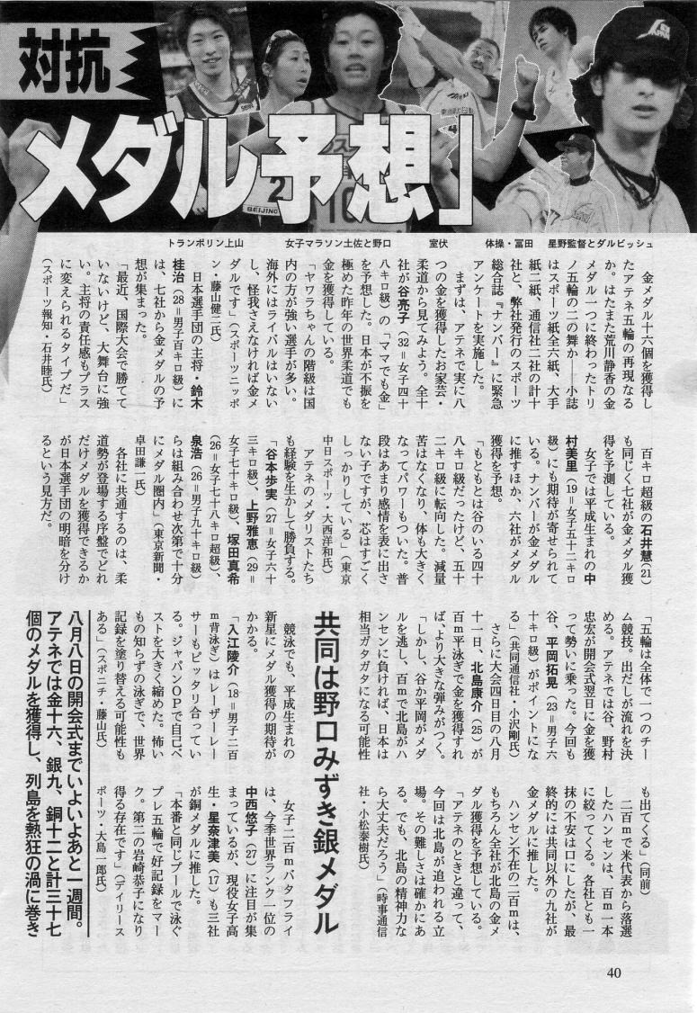 各誌メダル予想右欄外は、それぞれの結果を示す。 ↑ 野口の棄権はまったくの想定外で、当日の気象条件・レース展開・ゴールタイムを見ると、もし野口が出ていれば優勝を逃す要素は見当たらなかったのだが。 各誌、谷と野口のガチガチの金の目論見が外れ、銀以下の評価だった谷本・上野に救われ金の員数あわせに成功した感がある。 |