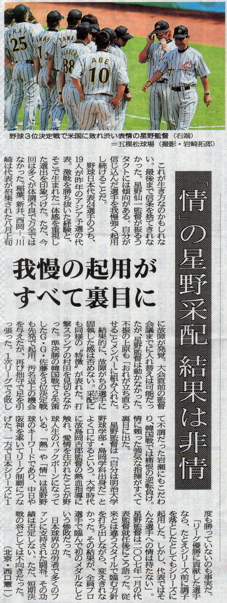 ム・トーナメントという戦い方による恩恵にあずかっただけ。 この方式・試合数であれば、アメリカ更にオーストラリアを含め、どこが優勝してもおかしくなかった。 これは、前WBCで1次リーグ、2次リーグと土を付けられた韓国に決勝トーナメントで一度だけ勝つことにより優勝したのとおなじことで、これまたキューバ・アメリカを加えたメンバーで相当数の試合を行い、勝率で優勝を決めれば、06年当時のメンバーでも日本の優勝は確約できなかった。 つまり、大リーガーを放出してしまった現在の日本プロ野球メンバーは調子が良かろうと、采配が的を射、的中しても確実に勝てるほど強くはないということである。 ただ、昨日本シリーズの落合を批判した心情主義の星野が、疫病神岩瀬と、 G.G.佐藤のような訳のわからない名前(これも活躍していればこんなことで攻撃されることもなかったのであろうが)の選手をホームポジションでない守備位置で使い続けたため、それでなくとも負けたかもしれない相手に、はっきりと特定できる敗因を作ってしまい、これまたはっきりとした批判の的を献上してしまった結果が、このような集中攻撃を浴びる状況を招いている。 だらしなく3位決定戦に廻ることが決ると、プロ球団の日本野球チームを応援しながらも、(今後のために、見せしめのためにあえて)負けて欲しい・メダルなく帰国して欲しいというムードが蔓延した様子も窺える。 WEB上には、 「(選手たちの労をねぎらった後)ただ、星野監督だけは話は別です。 大会前の謙虚さの欠片も無い言動もさることながら、 試合後の会見で逆ギレする礼節をわきまえない態度、 国の代表として恥ずかしくて見てられませんでした。 とても見逃すことはできません。 WBCの監督には、監督としての力量だけでなく、 国の代表監督としてふさわしい人を選んで頂きたいと 切に願います。 」 「試合後、韓国の監督は帽子を脱いであいさつしたのに、星野はそのままだった。マナーでも負けた」 (その際、星野の、土を付けられた相手を上から見下して、許してやるよと言わんばかりの横柄な態度に違和感を覚えた) 選手にしても、打ち崩された藤川がユニフォームも着ずにベンチ内に突っ立っているのも見苦しいものであった。 「星野のずうずうしい態度、むかつく顔、うっとうしい声、次の大会で星野が監督でないことだけが日本にとって幸いだ」 (最後のその期待、それは甘い考えかもしれない) http://digest2chsports2.blog19.fc2.com/blog-entry-1571.html などの声も。 |