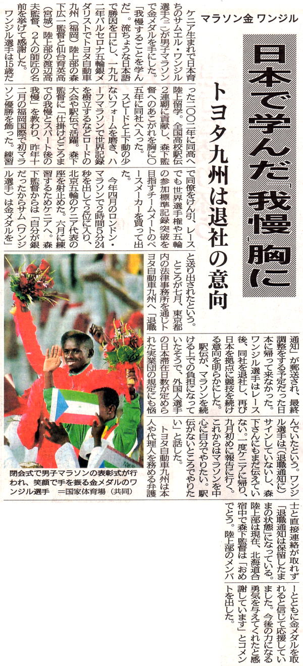今年7月以降ほぼ確定的だった退社情報であるが、 実業団の地元民として寂しいことである。 鐘紡を辞める際の早田俊幸の言葉も、「駅伝が・・・」 であったことを考えると、駅伝のスピード練習がマラ ソンの基礎の一つという、日本古来の理論に疑問も 生じる。 日本をトレーニングの拠点としたいとしているワンジ ル、瀬古の論理による駅伝回避となっている、ヱス ビー食品辺りが、さしずめ再就職先か。 |