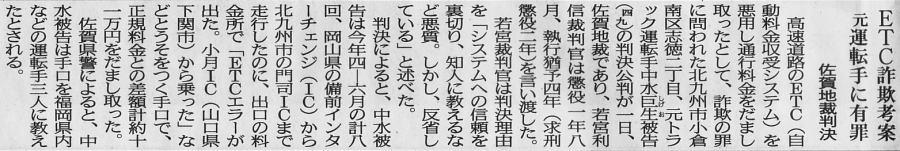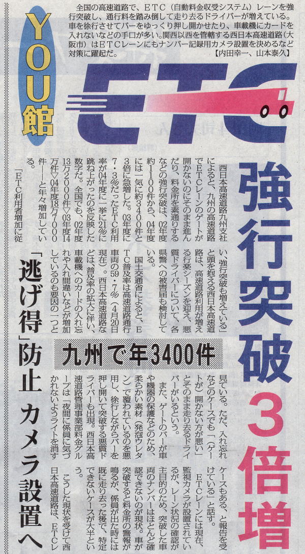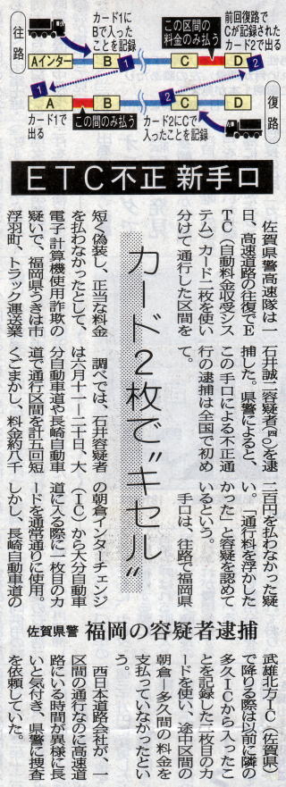 降りる際に使う“2”のカード、つまり「入」が記録されて「出」が記録されてないカードをどうして手に入れるか、に疑問を持った。 (左の記事で、「前回復路でCが記録されたカード2で出る」と図に描かれているカード“2”のこと) このカードを得るためには、「入」の記録のためETCゲートを通過する必要があり、「出」の記録を残さないために、ETCゲートを通過せずに降りる必要がある。 そこで降りるためにどうするのか、というわけ。 どうしてもスマートなやり方は考え付かず、有耶無耶にしていた。 ところが、以後左に紹介されている手口ほど手がこんでなく、結構幼稚な嘘の言い訳がまかり通っている実態が次々に報じられ(例えば↑12/1 の記事のような)、これら稚拙な手口に類似した手段で「入」のみ記録され、「出」の記録がないカードを手に入れているのであろうと推測するに至った。 |