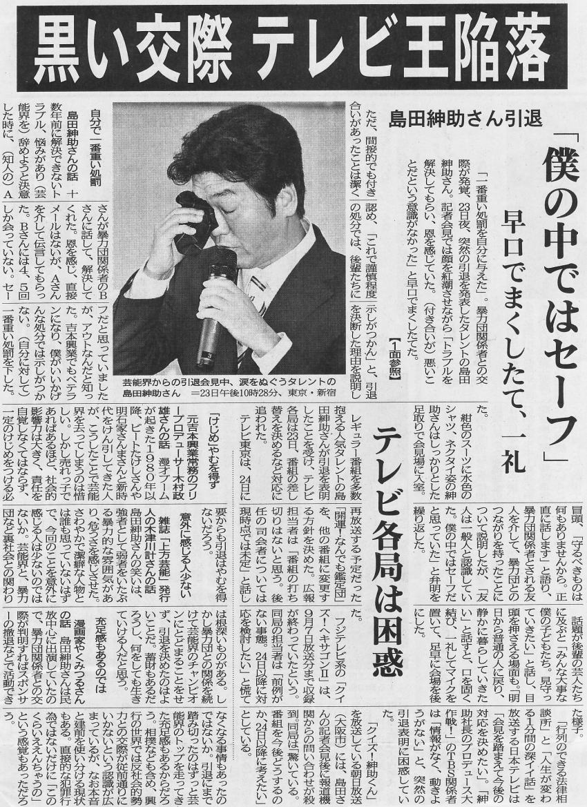 23日夜に突然の引退会見を行ったタレントの島田紳助さん(55)。トップスターとして多くの番組を仕切る華やかな活動の一方で、暴力団との交際という“闇”を抱えていたことも明らかになった。