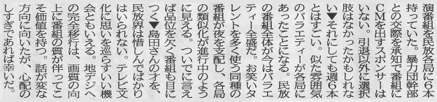 たけしじゃないが「嫌いなら見なけりゃいい」ではTVは通らないのは、上・麻生千晶文中にあるように「ジャーナリズムの一翼も担う社会の木鐸(ぼくたく)の一つ」であるのなら明らかなことであるが。