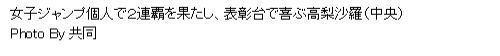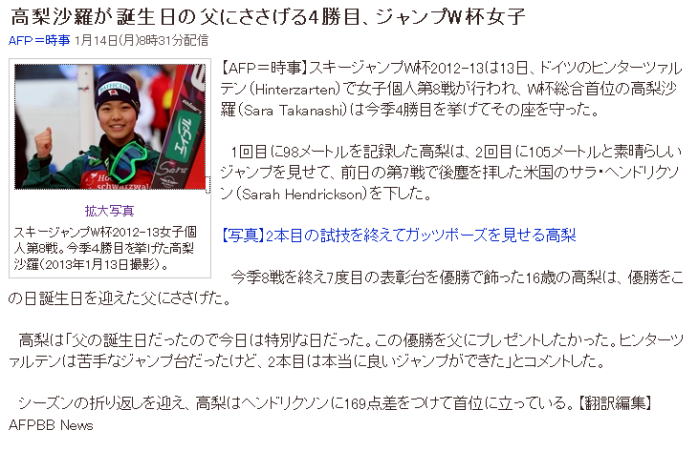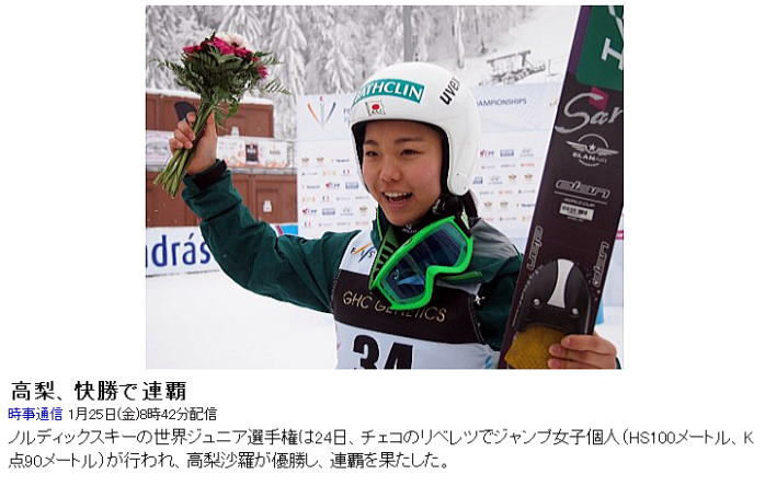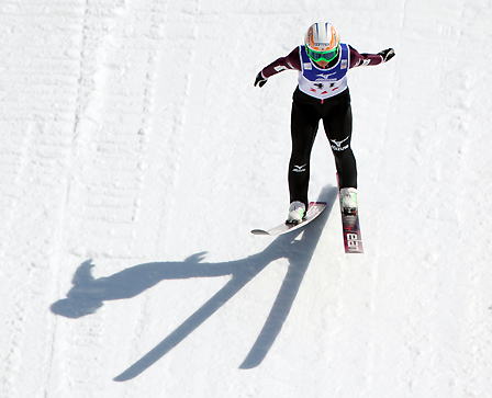 ジャンプ選手というより日本の女子アスリートとして、今や敵なしの勢いで世界を突っ走る高梨沙羅選手(グレート・マウンテン・インターナショナルスクール)。 その強さについては、ジャンプ関係者の誰もが認めるところ。 152cmの小さな体を逆に武器に、アプローチでの低い姿勢で風の抵抗を最小限に抑え、その勢いで一気にカンテを飛び出す。 そして空中では無駄な動きをせず、風をとらえて飛距離を伸ばす。 時には飛距離が出すぎて、課題のテレマーク姿勢をとれないこともあるが、その圧倒的な距離の差はライバルにとって強烈なプレッシャーを与える。 ワールドカップ総合優勝を決めた17日の大会では、1本目、2本目ともただ一人ゲートを下げても、スピードは3位に入ったサラ・ヘンドリクソンと比較してもほとんど同じ。 飛距離も1本目2位に2m、2本目4mという大差をつけており、これには各国の選手、コーチもお手上げ状態だった。 高梨選手の強さの秘密はこれだけではない。それは対応能力の高さにある。 札幌大会では強風の影響で、2戦とも満足な結果を残すことができなかった。「何かが狂っている」と蔵王へ移動するまでの2~3日のトレーニングで調整、ご存じのように蔵王ではあっさり連勝してしまった。 また、新しいジャンプ台でもきっちり結果を残しており、数本の公式トレーニングで克服してしまう。 非凡な才能とたゆまぬ努力で高梨選手の快進撃はさらに加速しそうだ。 (財団法人 全日本スキー連盟ページ)