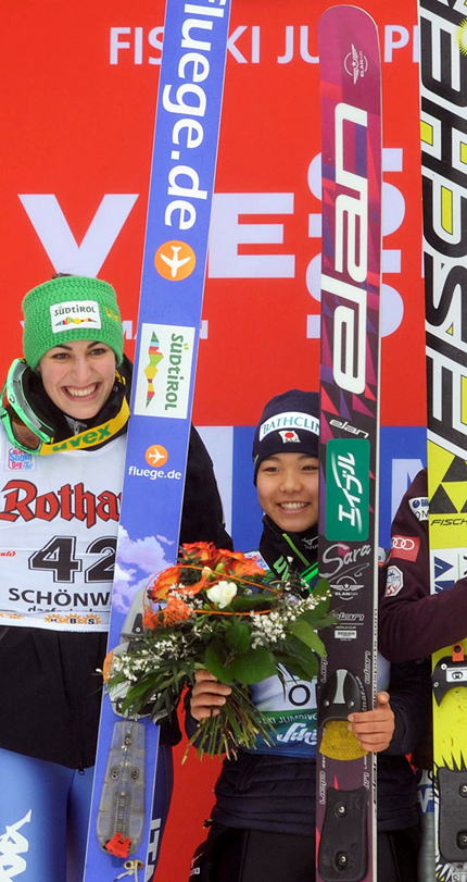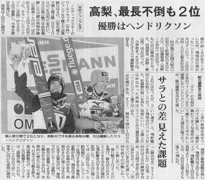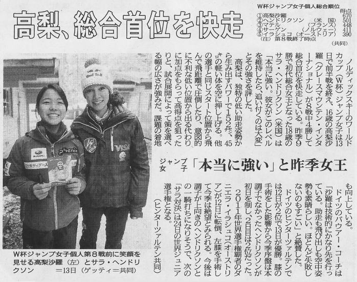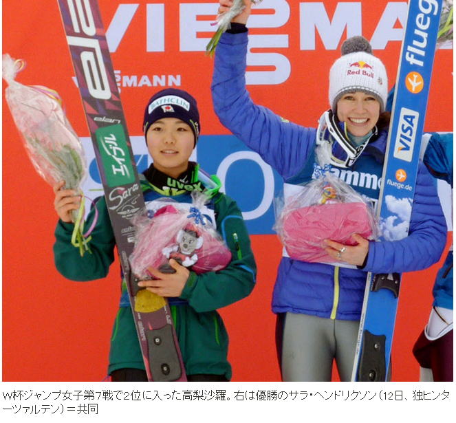 サラ・ヘンドリクソンが最長不倒で金、高梨沙羅2.7点差で銀。 優勝 サラ・ヘンドリクソン (アメリカ) 2位 高梨 沙羅 (日本) (日本) 3位 ジャクリーン・ザイフリーズバーガー (オーストリア) 前に、沙羅W杯総合優勝、そして五輪金への期待に対する危惧として、サラの復調後(不完全な体調の中しぶとく2位を堅持し続ける実力をみて)の脅威を書いた が、まさしくこの世界選手権におけるヘンドリクソンの強さは、今季W杯チャンピオンの沙羅を完全に上回るものであった。 ※右のとおり、両“さら”の板の長さはまだほぼ同じというかむしろ沙羅のほうがやや長そうである。サラが体重を戻してツール面で優位を得るとなればさらに脅威は増す。 |