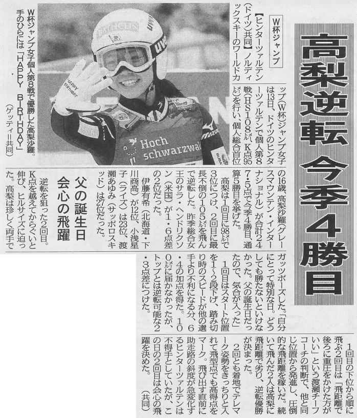 スキージャンプ女子の高梨沙羅選手が17日、スロベニアで行われたワールドカップ個人の第14戦で優勝して今シーズン8勝目を挙げ、ワールドカップ総合優勝を果たした。ジャンプのワールドカップで日本選手が総合優勝したのは、男女を通じて高梨選手が初めてで、高梨選手は16歳4か月でワールドカップ史上最年少での優勝となった。 高梨選手は今シーズン、ここまで13戦で7勝を挙げてワールドカップの総合トップを走り、17日、スロベニアで第14戦に挑んだ。 高梨選手は1回目、89メートル50を飛んでトップに立つと、2回目は92メートルを飛んで優勝し、今シーズン8勝目を挙げた。 高梨選手は、ワールドカップの総合得点を1137点に伸ばし、2位につける昨シーズンのチャンピオン、アメリカのサラ・ヘンドリクソン選手に290点の大差をつけて、2試合を残して総合優勝を決めた。 ジャンプのワールドカップで日本選手が総合優勝するのは、男女を通じて高梨選手が初めてで、高梨選手は16歳4か月でワールドカップ史上最年少での優勝となった。スキーの種目別でのワールドカップ総合優勝は、ノルディック複合の荻原健司選手や、フリースタイルモーグル女子の上村愛子選手など、日本選手で7人目となる。高梨選手は、ワールドカップの総合優勝が決まったことを試合のあとのインタビューで初めて知って驚いた様子を見せ、「もう決まったんですか。総合優勝できるかどうかはあまり考えていなかったのでびっくりしました。1回目のジャンプは課題だった着地の姿勢がしっかり決まってよかったです」と振り返った。そのうえで、総合優勝できた理由について、「地道にトレーニングしてきた成果もありますが、日本チームの支えが大きいです。家族より長い時間一緒にいて、生活面や精神面でとても助けられました」と話した。さらに、このあとイタリアで開かれる世界選手権に向けては、「きょうできたことをしっかりイタリアに持っていけたらいいなと思います。結果にとらわれず、自分のジャンプをして楽しく飛びたいです」と抱負を話していた。 高梨選手 総合優勝への軌跡 高梨選手は、北海道上川町出身の16歳。 去年、上川町の中学校を卒業したあと、現在は北海道旭川市にあるインターナショナルスクールに在籍している。ジャンプ女子のワールドカップが始まった昨シーズン、高梨選手は優勝1回、2位が6回で合わせて7回表彰台に上がり、総合成績は3位。総合優勝は、2歳年上のライバル、アメリカのサラ・ヘンドリクソン選手。 今シーズンに入ると、高梨選手は11月の個人の開幕戦で、ヘンドリクソン選手を抑えて優勝。このあと、来年オリンピックが行われるロシアのソチでの2試合は2位と3位に終わったが、第4戦と第5戦を連勝、第8戦でも優勝して、地元・日本で行われる4連戦を迎えた。ところが、札幌市での2試合は12位と5位で、今シーズン初めて2試合連続で表彰台を逃した。しかし、続いて山形市の蔵王で今月10日に2試合行われた大会は、圧倒的な強さで2連勝して札幌大会の雪辱を果たし、前日の第13戦も制して総合優勝に向けて大きく前進していた。 高梨選手の強みは 高梨選手が遠くに飛べる理由は、いくつかある。 まずは、「スムーズな踏み切り」。時速90キロにもなる助走のスピードを最大限に生かし、タイミングよく、力強い踏み切りができることが最大の理由。また、修正能力の高さも理由の1つ。 ジャンプのスーツはシーズン前、より密着したものにルールが変わり、浮力を得にくくなった。スーツの変更で、高梨選手はシーズン前、空中でのバランスを崩し、苦しんだという。しかし、改善点をジャンプする前の助走に見いだし、助走の姿勢を安定させる努力を重ねたことで、空中でのバランスを取り戻し、第1戦でいきなり優勝を果たした。 また、今シーズン初めて2試合連続で表彰台を逃した札幌大会のあとは、助走でのひざの微妙な開きを1週間で修正し、その後の蔵王大会の2連勝に結び付けた。遠くに飛べる理由について、高梨選手は、「もっと遠くに飛びたい、遠くに飛んだらどうなるんだろうという気持ちではないかと思います。 こう飛べばこうなるといったように大体イメージができるんです」と話していて、「好奇心」の強さと「想像力」の豊かさを挙げている。 (NHKページ)