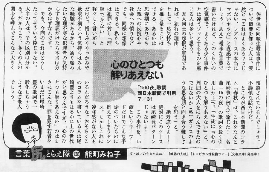 下の佐世保高1同級生殺人についても殺人者の“心”をステレオタイプに推し量って突っ込みを入れられていた「春秋」が、ネトウヨ(ネット右翼)ならぬネトウト(ネット疎い=マイ造語)で少々恥ずかしい立場に立った。