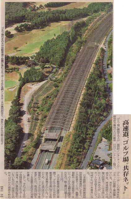 日本道路公団福岡建設局別府管理事務所によると、この防球ネットは、鉄製の骨組み(高さは6.8b)の上から金網をかぶせたもの。総工費は11億3000万円。