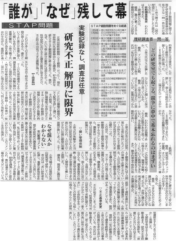 最初から出来ないとわかっていながら、その検証をしなければならないというまったくもって不毛な実験に拘束されたスタッフはさぞわが身の不遇を託ったことだろう。 左のカット及びそのディスクリプションは、検証が打ち切られ、実験を行うものがいなくなったことをアガサ・クリスティのミステリ「And Then There Were None(邦題:そして誰もいなくなった)」に掛けたものであろう。 「STOP」と言ってるのさえ、「STAP」に寄せたものと勘ぐれないこともない。 しかし、「そして・・・」は、実は皆いなくなったわけではない、犯人はちゃんと生きていて、そのからくりがメインのトリックとなっているわけで、この設えは正しいとはいえない。 もっとも、この再現実験においても、実は続行している誰かが未だいるという希望・謎を提示したかったのか。 |
