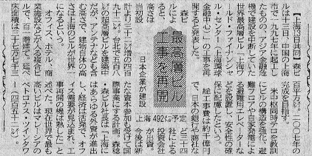 【上海13日共同】森ビルは13日、中国の上海市で 1997年に起工したものの、アジア金融危機で建設を中断していた世界最高層ビル「上海ワールド・