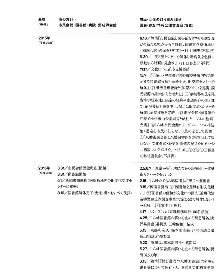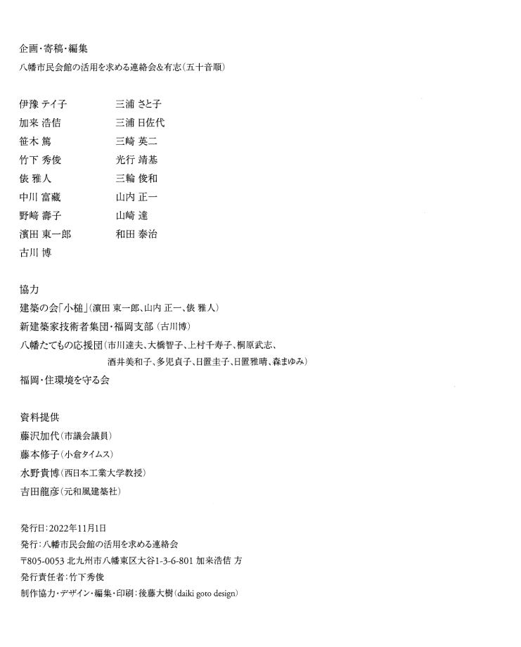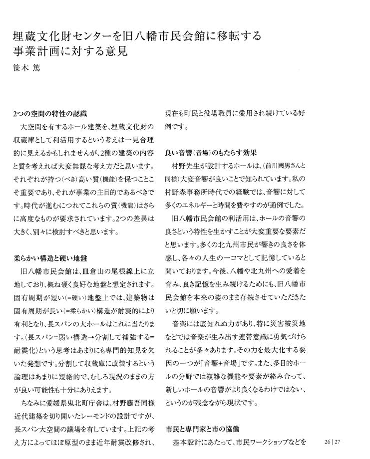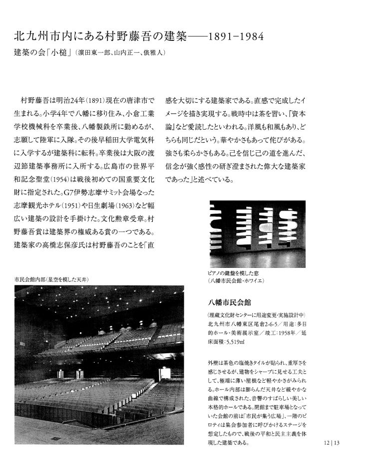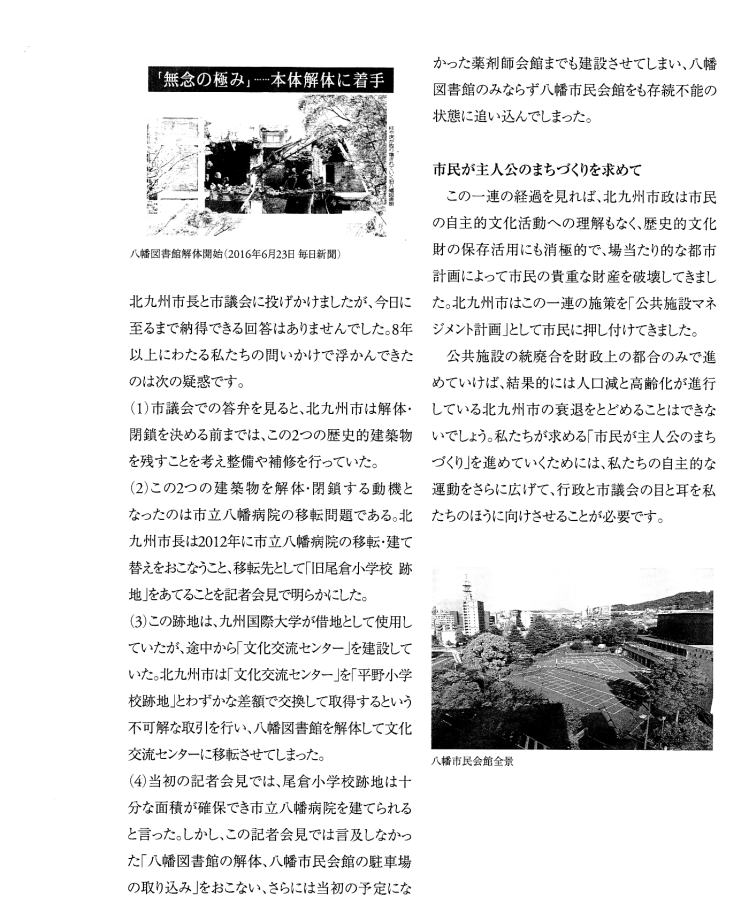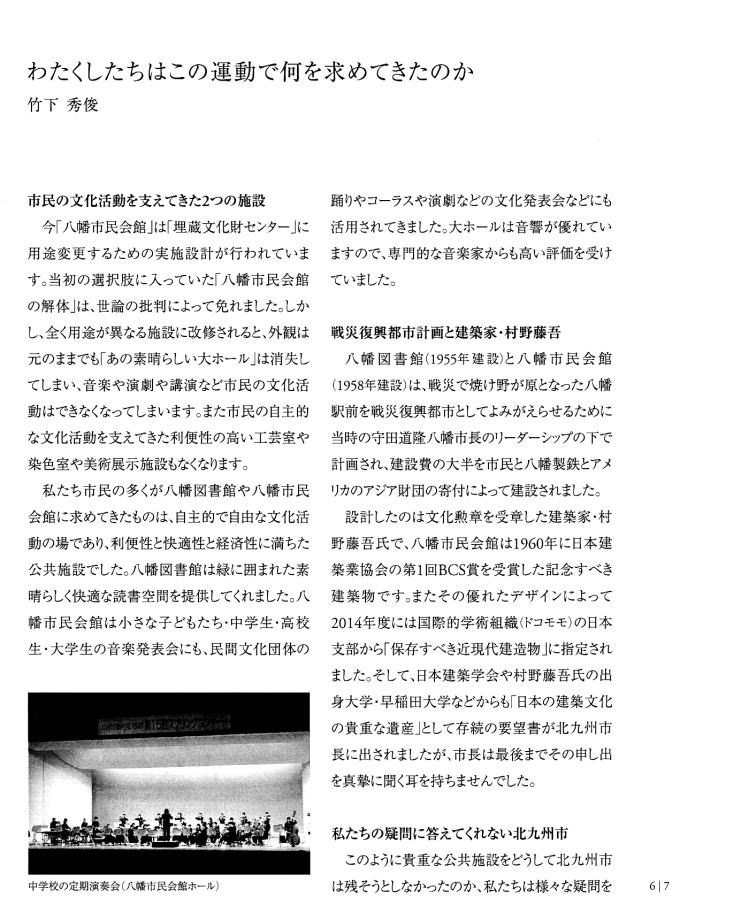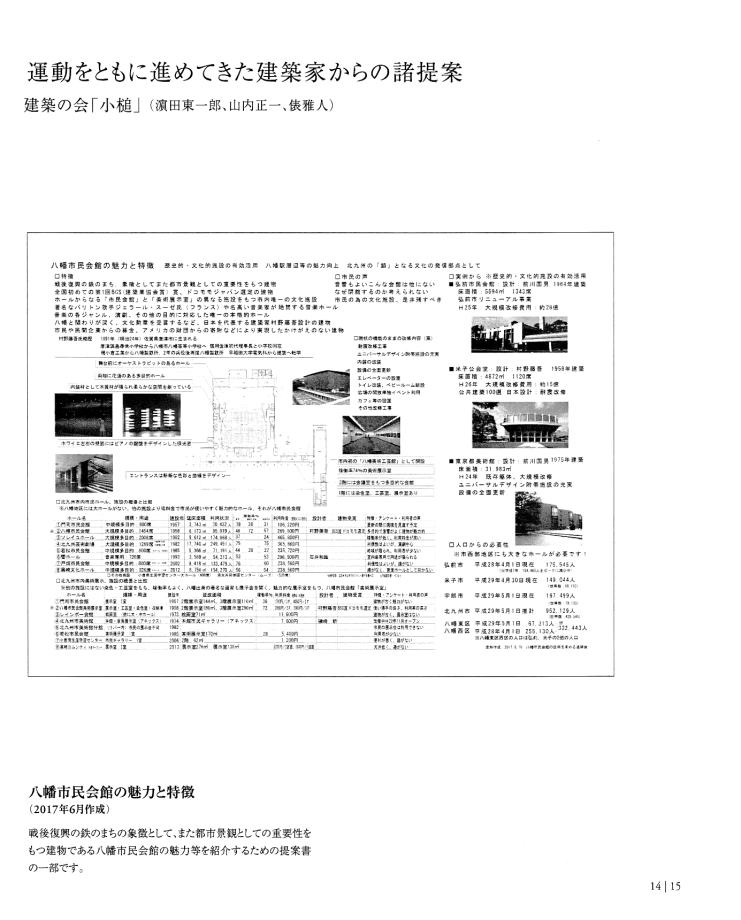 | 「ホンモノは『残さないでよかった』ことは一度もなく、『残してよかった』か『残せばよかった』しかない。」 は、 東京女子大学、東棟・体育館の解体を「世界的な文化遺産」を守ろうとして闘った発起人OGの一人、作家の永井路子の言葉である。 以下の引用は、「八幡市民会館(北九州市) 保存・活用」運動につき記された冊子を入手した私が、勝手に自炊し転載したものである(したがって、関係者により〝削除〟を命じられれば直ちに削除いたしますので、 info@toakes.co.jp まで mail いただきますようお願い致します)。 |
