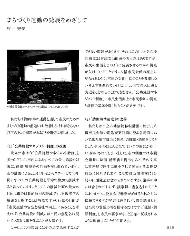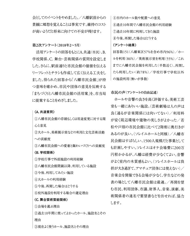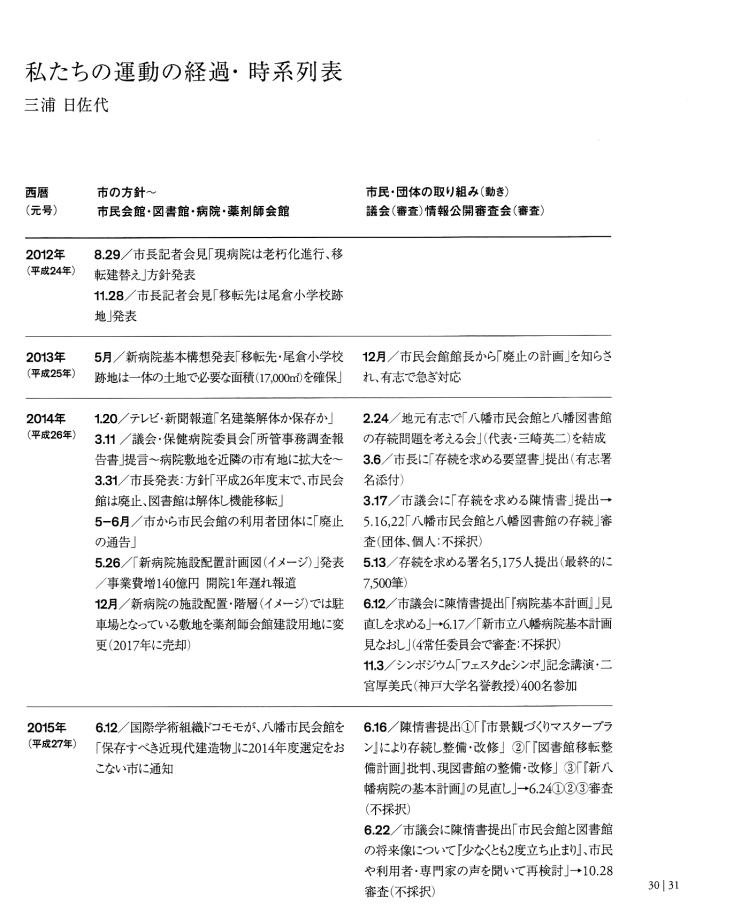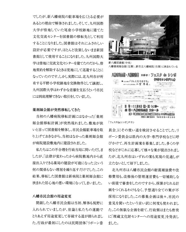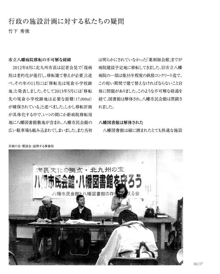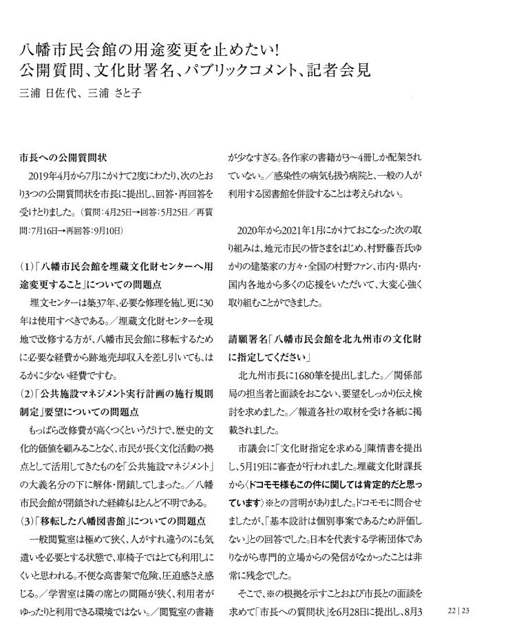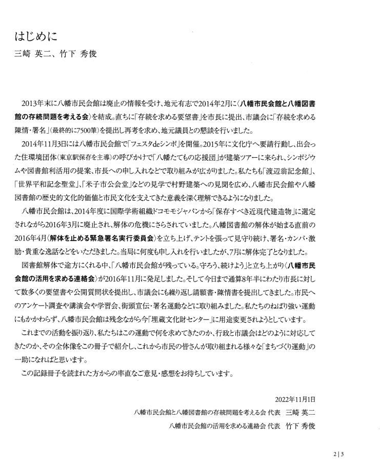| 「ホンモノは『残さないでよかった』ことは一度もなく、『残してよかった』か『残せばよかった』しかない。」 は、 東京女子大学、東棟・体育館の解体を「世界的な文化遺産」を守ろうとして闘った発起人OGの一人、作家の永井路子の言葉である。 以下の引用は、「八幡市民会館(北九州市) 保存・活用」運動につき記された冊子を入手した私が、勝手に自炊し転載したものである(したがって、関係者により〝削除〟を命じられれば直ちに削除いたしますので、 info@toakes.co.jp まで mail いただきますようお願い致します)。 |