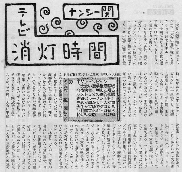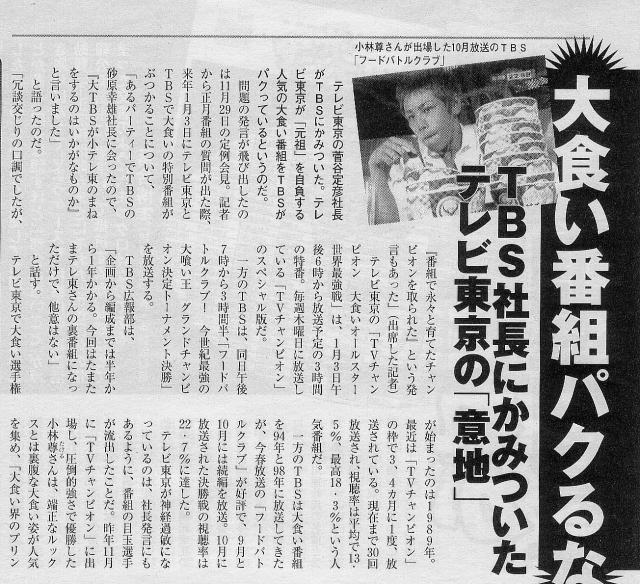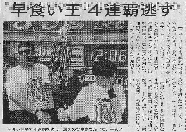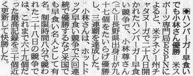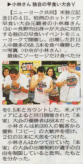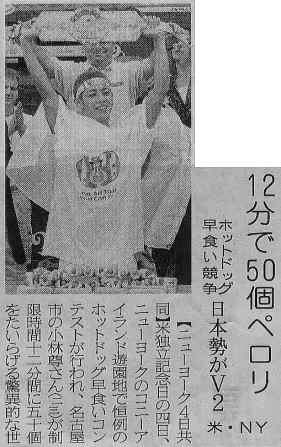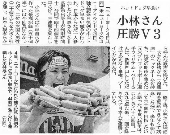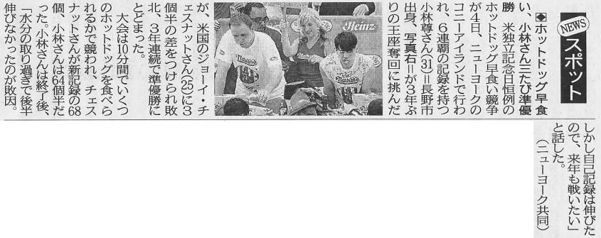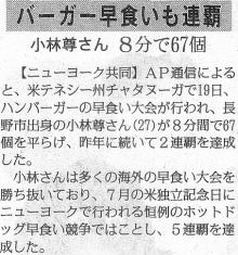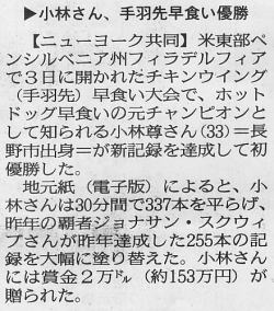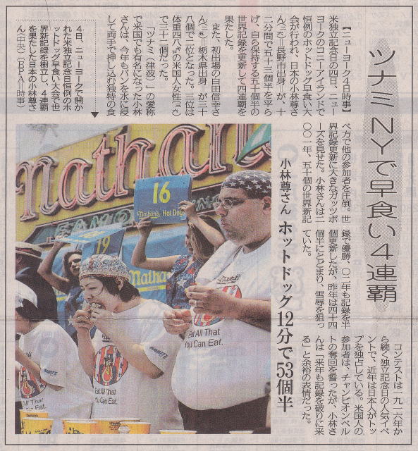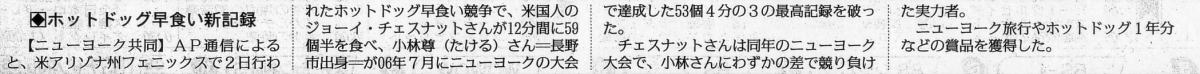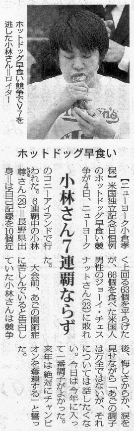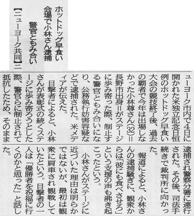 毎年このイヴェントについては、7/5 の夕刊・7/6 の朝刊に写真とともにかなり詳細な内容を掲載していた西日本新聞であるが、小林が三連敗した昨年でかなり露出度は少なくなり、本来なら不参加の今年は、ホットドッグ早食い競争そのものの記事が危ぶまれるところであった。 ところが、会場に観客として来ていた小林が彼の言によると「(観客の)彼にも食わせろ」の声に乗せられステージに上がろうとして制止する警官ともみ合いとなり逮捕されるという思わぬ事態がおこり、7/5の夕刊に関連記事が掲載されることになったようである。 そのため、この記事はホットドッグ早食い競争の結果を伝えていないが、他メディアにおいても下のとおり、競技内容については4連覇したジョーイ・チェスナットおよびその記録を伝えるのみである。 |
