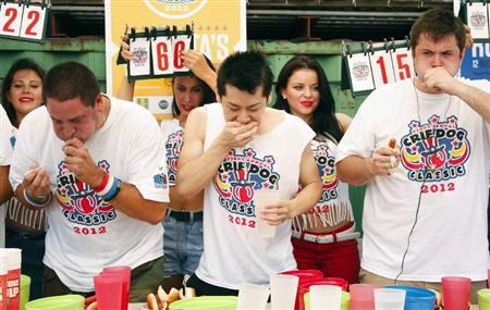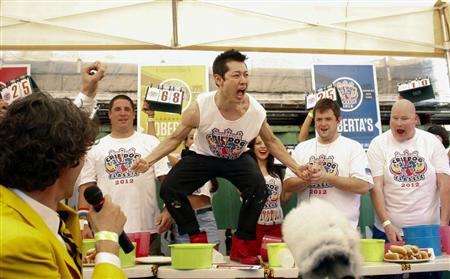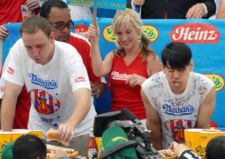 ![]() ニューヨークで4日開かれた早食い大会で、ホット ドッグを食べる小林尊さん=ロイター |