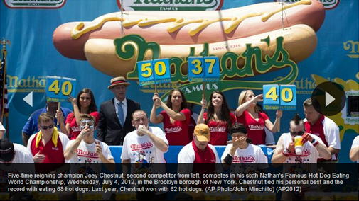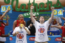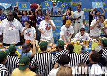 | 米国で毎年恒例となっているホットドッグ早食いコンテストが今年も独立記念日に開催され、日本の小林さんが見事6連覇を達成されました。小林さんは、12分間に53と3/4個をたいらげ最高記録を更新。 また、いつもは小林さんの圧勝に終わる大会だが、今年は強力なライバルが現れ、最後まで小林さんとデッドヒートを繰り広げた。そのライバルとはアスパラガスの大食い世界記録保持者のチェスナットさん。 来年はチェスナットがどのぐらい成長してるかによって、小林さんの7連覇も危なくなるかもしれません。 (UG ZONE@ニュース 2006.7.6)