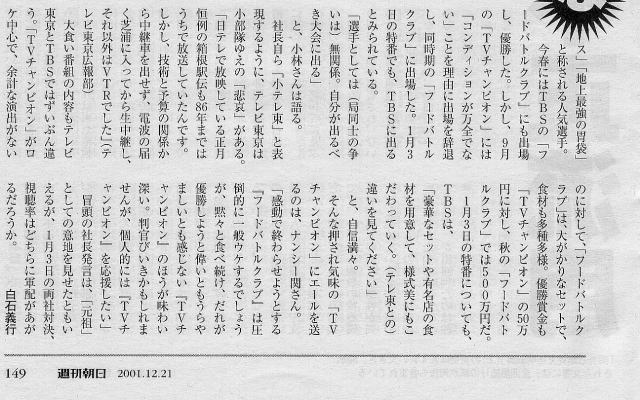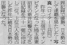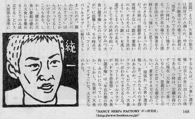 ←西日本新聞'01.7.? 上記・ナンシー関の記事中、中心人物として取り上げられている、小林が優勝した大会を報じた記事である。 一段下の記事からの流れを辿れば、 '96から'98まで中嶋広文が3連覇し、'99に久しぶりの地元優勝者が出、'00にまた日本人・新井和響が勝ち、 '01、とてつもない記録で小林尊が優勝したということになる。 |