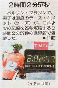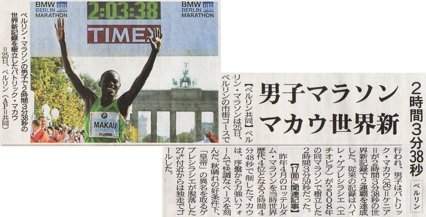 高岡の日本記録以来の10年間の停滞・低迷に比して、世界記録が4度更新されたとあるが、この文章にはギミックがある。 現在の世界10傑をみるに、記録はすべて2003年以降、つまり高岡の日本記録以後に記録されている。 しかも、10位の記録は 2.04.55 で、高岡の記録 2.06.16 より遥かに上であることから、この 10 年間に高岡の記録を上回るタイムが10位以下としてもかなり樹立されているだろうことは容易に察しがつく(世界記録は4度ほどしか更新されなかったかもしれないが)。 ここに記載されている文章になんの予備知識もなく接した読者は、日本人の停滞に対する世界の動きを過小評価してしまいかねない。 意図した筆致であるのかもしれないが、身びいき過ぎ生温い記述である。 |