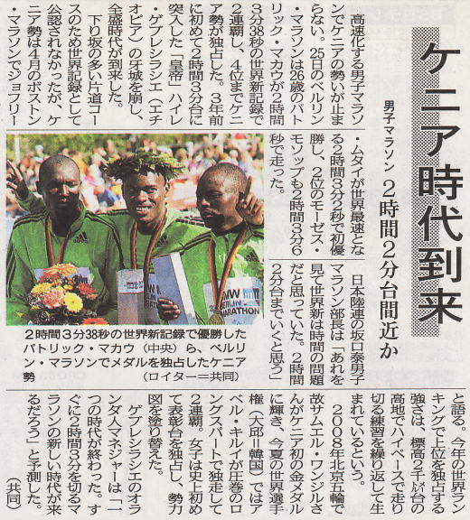 なぜ昔のマラソンでは強かったのか このように、優れた身体能力を持つ黒人に対し、かって日本人が勝利しえたのはどうしてなのか。 一つには本当に優れた黒人ランナーがマラソンを走っていなかったからであり、も一つは能力がありながら近代的トレーニングを行っていなかったがために、 それらで先行した日本人の後塵を拝していただけのことである。 北京五輪マラソンで勝ったワンジルは、仙台育英高・九州トヨタで育ち、詳しいことを知る身ではないが、昨夏の世界陸上1万m勝者のジェイランも日本のホンダに所属していての快挙であるからあながち日本の強化策が遅れをとっているとは思えない(確かにワンジルは勝利後、日本の駅伝偏重を批判してはいたが)。 |