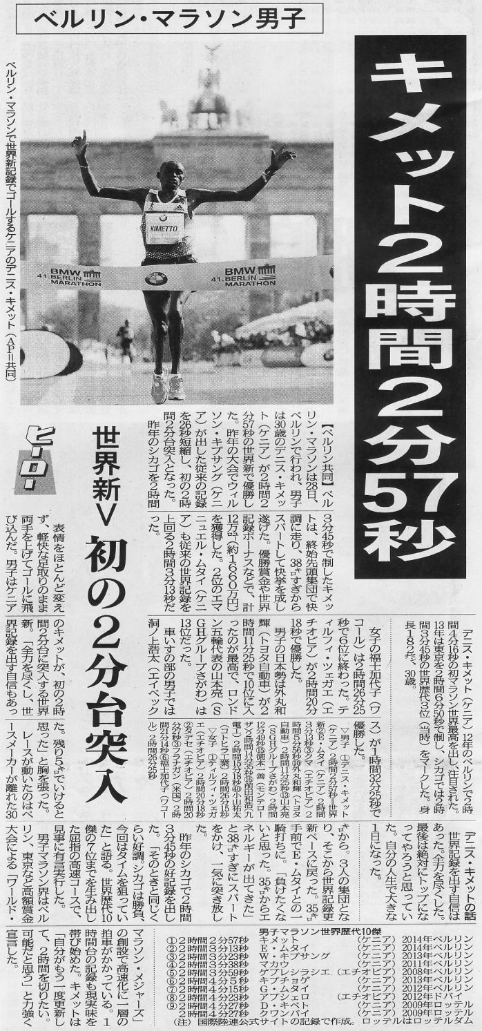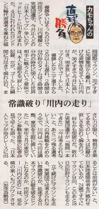 ![]() ↑ フランクフルトを2時間3分42秒で走った、ウイルソン・キプサング(ケニア) 日本が世界の高速化について行けないのはもう何度も見せつけられているが、実力者の揃わなかった福岡国際では笑えるほどの力の差を突きつけられたと言える。 右で「カモちゃん」とやらは暢気に勝負の観戦を楽しんでいるようだが、日本陸連(というのか?)の当事者連はもうお手上げ状態だろう。 川内は、公務員ゆえに練習量も少なく、特にフルマラソンの距離を走ることも稀だそうなので、自身も言っているとおり、試合が練習の一環ということで、使い減りしていない身体だから短いスパンでレースがやれるのはある意味当たり前のことだろう。 |