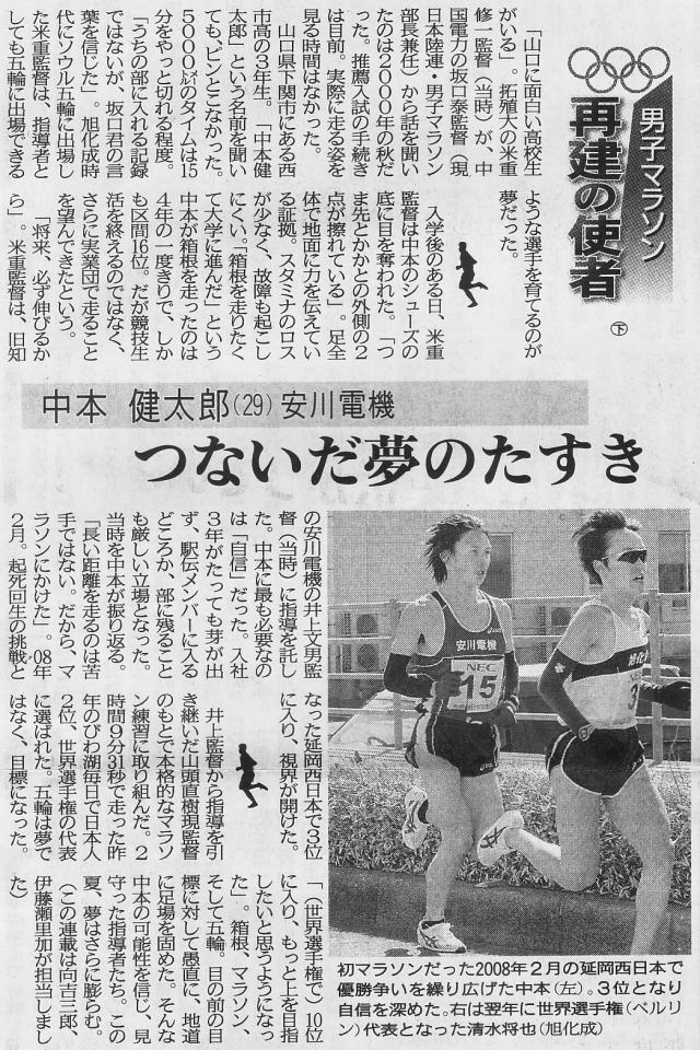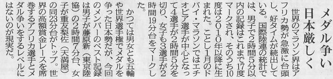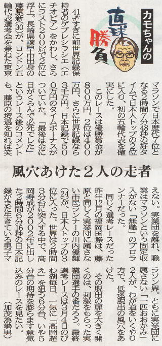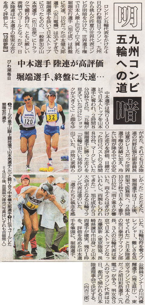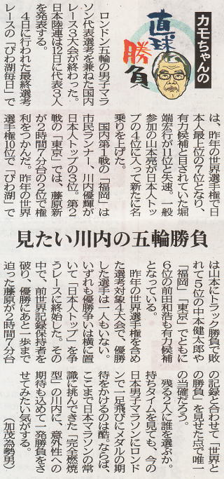 約2%世界に近いといえ、それだけ強化・意識の高さが人種による身体能力の差をカバーしているともいえるのではないか。 ここで、sportsnavi で言う“国民の意識”について考えると、日本人のマラソン・駅伝好き国民性は、伊東浩司より高岡寿成の知名度が高いということからも明らかなように、マラソンに対する想い入れは大きい。 世界と互角に戦ったという意味では、100メートル走は1930年代の“暁の超特急”吉岡隆徳まで遡らねばならず、一方マラソンは日本新が絶えて久しいがそれでも高岡はまだ10年の昔、この、栄光の幻を追い続ける(諦めきれない)想いの差が“国民の意識”に表れているといったところだろうか。 こう言っていて、アテネ五輪の野口のような大番狂わせが起こるとしばらくは 発言の“蟄居”を余儀なくされる羽目に陥るが、今回のメンバーでは女子も含めてそのような“危惧”は余計であろう。 |