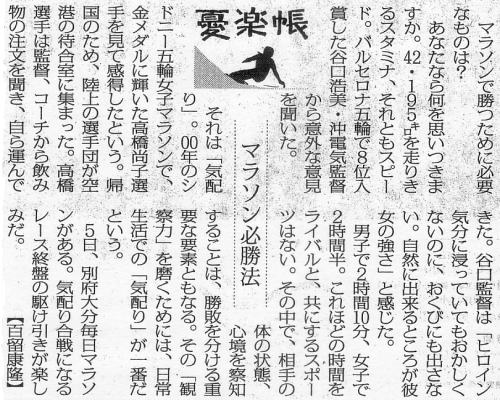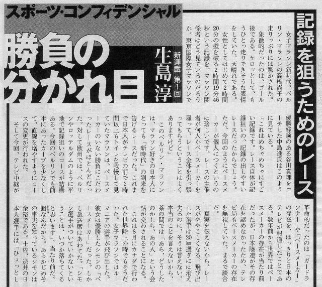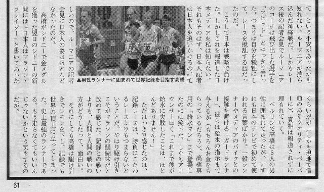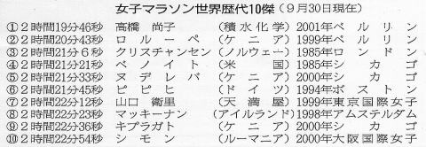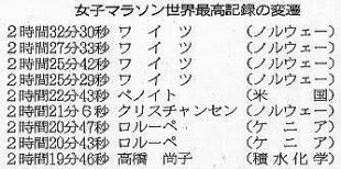 中山竹通(オリンピック最終選考会レースを故障で欠場し、陸連の温情追加レースで選考された瀬古に対し、「這ってでも来い」と発言した)が何かの記事で、「この日本記録程度のスピードで走れる選手はまだ何人か見出せるほど日本女子の層は厚く水準は高いが、世界記録となると渋井を始め日本トップクラスのトラックスピードではまだまだ無理」とあったが、ラドクリフはこれより4分も前にいるのだから、この日本新記録もやや色あせて見えるのは私だけの感想か。