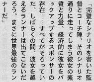 故障を押しての出場・選考会最高の記録を逆転で(マラソン経験のない田中めぐみ相手で助かった)これまた表情豊かに演出したということで、この3人に前回の有森・瀬古に対すると同等の拒否反応を国民が示すことはない。
