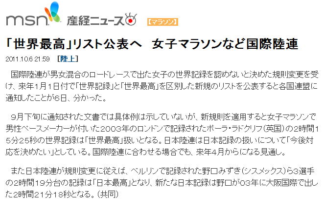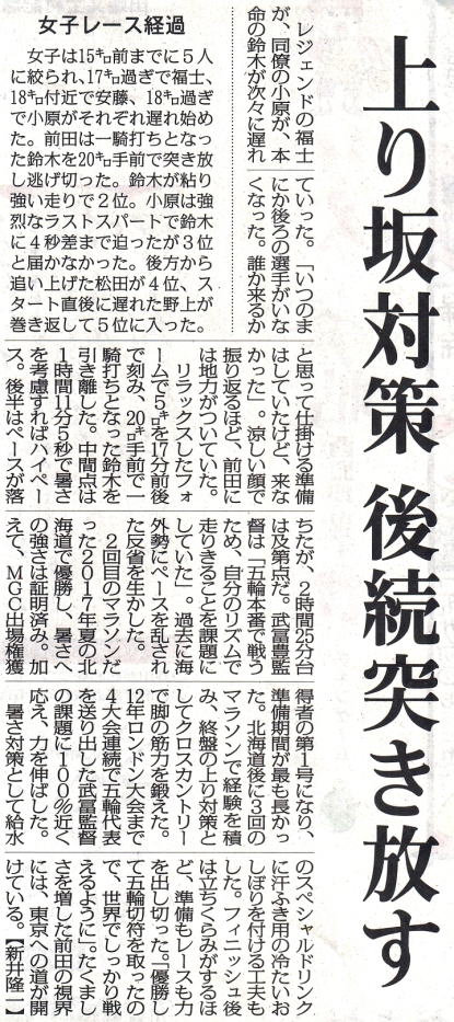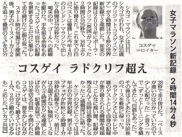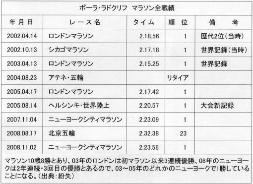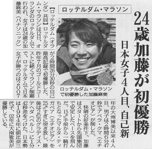 両者ともに(渋井はいっそう)今後の成長を考えても、まさかマラソンで世界に太刀打ちできると本音で言える専門家はいないとの確信からであるが、いくらロンドンマラソン5位と対等に戦ったとはいえ有力なアフリカ勢皆無のレースでこの結果は寂しすぎるし、無名の選手の台頭も見られずじまい(渡辺裕子という存在すら知らなかった新人が自己新で3位に入っていたが、いくらマラソンとはいえ151CMと沙羅(高梨)並みの体型ではいかにも線が細すぎると思うが)。