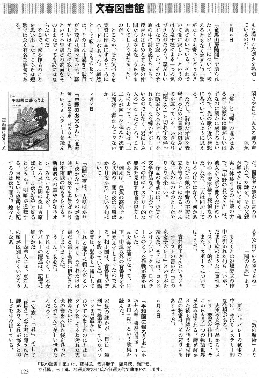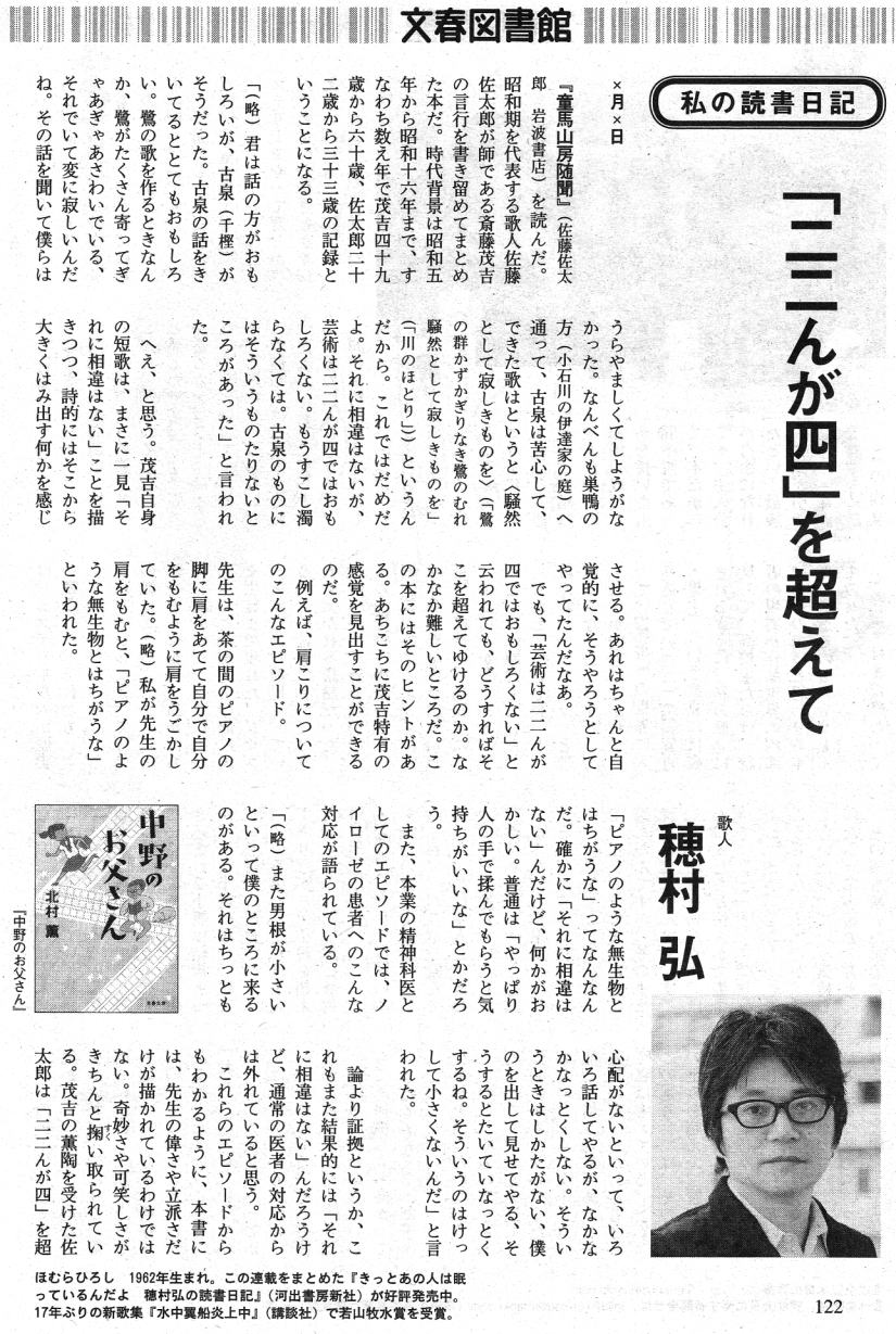 文春を買っても本欄・「私の読書日記」は必ず読むものでもなく、思うに上記執筆者中読んでみた記憶にあるのは酒井順子・立花隆くらいで、この穂村弘に関しては読んだこともなく、名前も今回読んだ後に確認した次第で、この文章が気に入ったから俎上に載せたわけではない。