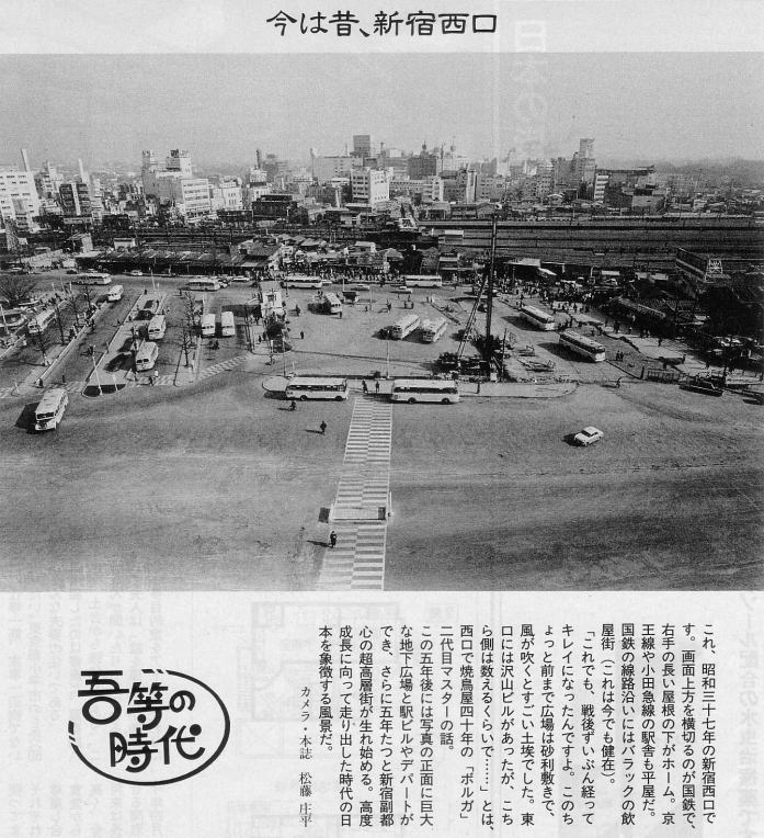 昭和38年から3年間くらいは、毎日のように東口に降りたち、歌舞伎町のジャズ喫茶へ通ったものだが、当時西口へ出ることは皆無(思い出横丁(昔のしょんべん横丁)へ立寄るようになったのは、同42年福岡へU ターンして後の上京時からであるから、西口前が整備され始めた頃(淀橋浄水場といった懐かしい名前を聞いていた頃)といってよかったので、こんな景色の記憶はまったくない。