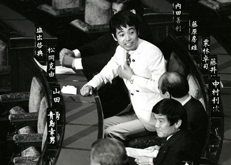 | 昭和46年7月、初登院した参院では先輩の青島幸男、山田勇(横山ノック)両議員 と並び、本名「松岡克由」の氏名標が置かれた議席で笑顔を見せた 既にこの時より40年、当り前ともいえるが3人とも鬼籍に |