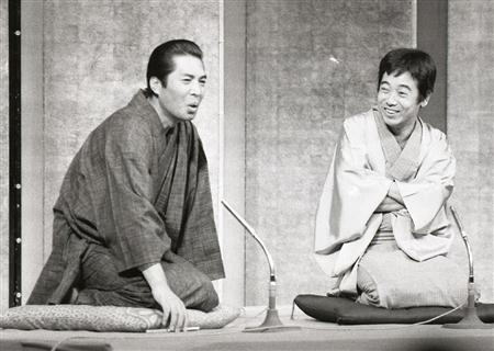 五代目三遊亭円楽さん(左)と対談し、少年のような笑顔を見せる立川談志さん 関東の落語界を背負った巨星の貴重なツーショットだ=1978年10月 |