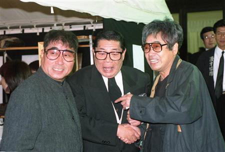 | どこでも笑顔を絶やさなかった立川談志さん(右)。ケーシー高峰(中央)、毒蝮三太 夫と=1997年10月8日、漫才師、内海好江さんの通夜で |
