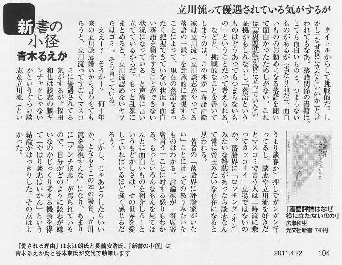 つまり、“落語とは・・・”といった理に走り、あからさまに客を自分より下位におく態度が鼻持ちならず、客が逆に阿っている様子を、談志の死後自殺した(と言っても、決して後追い自殺したわけではない)塚越孝も談志猫の首に鈴をつけられない追従評論家もどきの姿を文にしている。